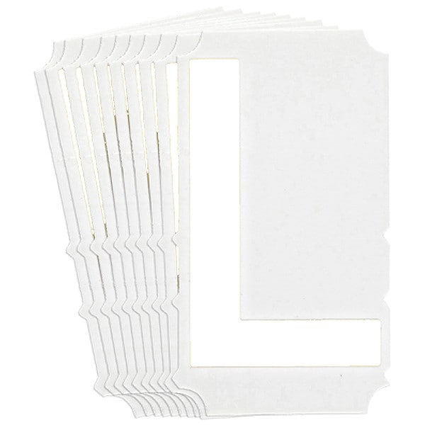 Letter Label, Adhesive Type Permanent Adhesive, Application General Identification, APWA Compliant Color No, Background Color Not Applicable, Character Color White, Character Color Gradient Solid Color, Character Height 6 in, Character Outline Color Not Applicable, Character Type Letters, Characters Included L, Die Cut Yes, Embossed No, Font Gothic, Includes (10) Labels, Indoor/Outdoor Usage Indoor/Outdoor, Letter Casing Uppercase, Material Polyester, Meets USCG Registration Guidelines No