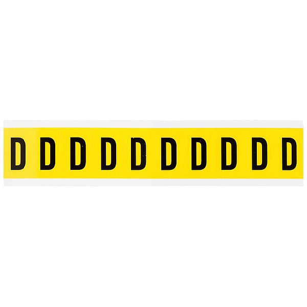 Letter Label, Adhesive Type Removable and Repositionable Adhesive, Application General Identification, Wire and Cable Labeling, APWA Compliant Color No, Background Color Yellow, Character Color Black, Character Color Gradient Solid Color, Character Height 1 in, Character Outline Color Not Applicable, Character Type Letters, Characters Included D, Die Cut Yes, Embossed No, Font Gothic, Includes (10) Labels, Indoor/Outdoor Usage Indoor Only, Letter Casing Uppercase, Material Vinyl Cloth