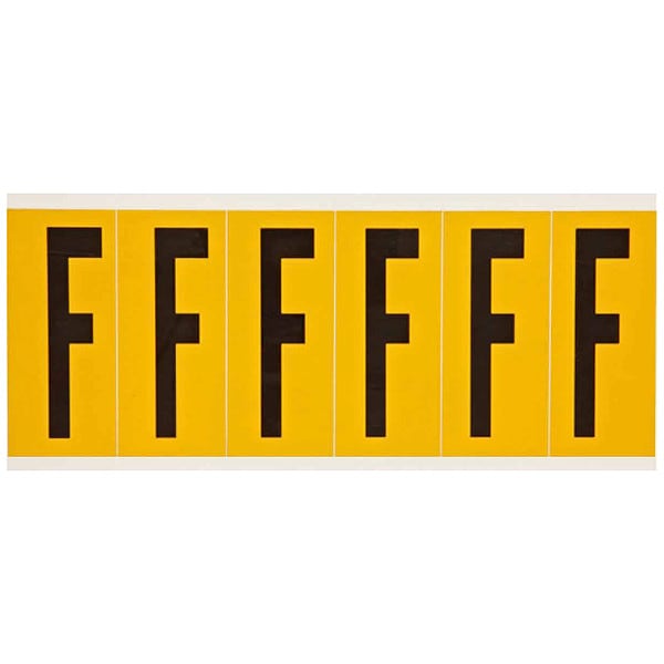 Letter Label, Adhesive Type Permanent Adhesive, Application General Identification, Pipe and Valve Marking, APWA Compliant Color No, Background Color Yellow, Character Color Black, Character Color Gradient Solid Color, Character Height 3 in, Character Outline Color Not Applicable, Character Type Letters, Characters Included F, Die Cut Yes, Embossed No, Font Gothic, Includes (6) Labels, Indoor/Outdoor Usage Indoor/Outdoor, Letter Casing Uppercase, Material Vinyl