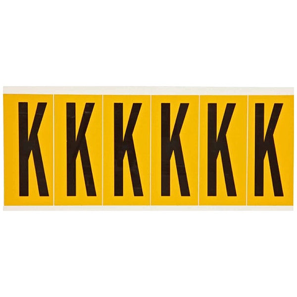 Letter Label, Adhesive Type Permanent Adhesive, Application General Identification, Pipe and Valve Marking, APWA Compliant Color No, Background Color Yellow, Character Color Black, Character Color Gradient Solid Color, Character Height 3 in, Character Outline Color Not Applicable, Character Type Letters, Characters Included K, Die Cut Yes, Embossed No, Font Gothic, Includes (6) Labels, Indoor/Outdoor Usage Indoor/Outdoor, Letter Casing Uppercase, Material Vinyl