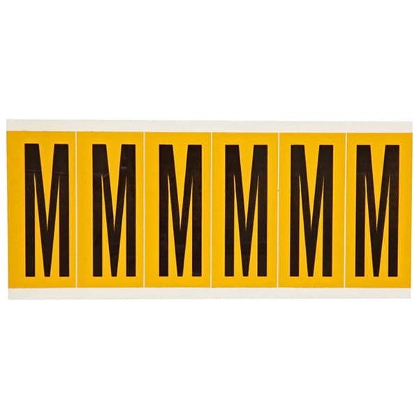 Letter Label, Adhesive Type Permanent Adhesive, Application General Identification, Pipe and Valve Marking, APWA Compliant Color No, Background Color Yellow, Character Color Black, Character Color Gradient Solid Color, Character Height 3 in, Character Outline Color Not Applicable, Character Type Letters, Characters Included M, Die Cut Yes, Embossed No, Font Gothic, Includes (6) Labels, Indoor/Outdoor Usage Indoor/Outdoor, Letter Casing Uppercase, Material Vinyl