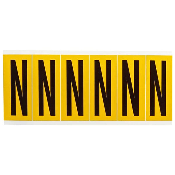 Letter Label, Adhesive Type Permanent Adhesive, Application General Identification, Pipe and Valve Marking, APWA Compliant Color No, Background Color Yellow, Character Color Black, Character Color Gradient Solid Color, Character Height 3 in, Character Outline Color Not Applicable, Character Type Letters, Characters Included N, Die Cut Yes, Embossed No, Font Gothic, Includes (6) Labels, Indoor/Outdoor Usage Indoor/Outdoor, Letter Casing Uppercase, Material Vinyl