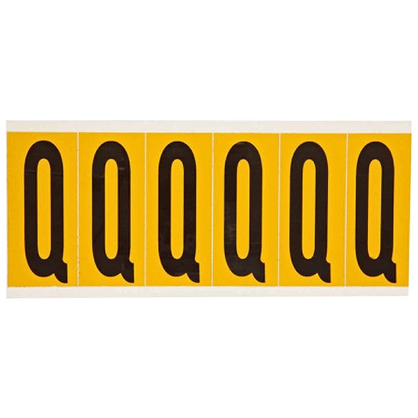 Letter Label, Adhesive Type Permanent Adhesive, Application General Identification, Pipe and Valve Marking, APWA Compliant Color No, Background Color Yellow, Character Color Black, Character Color Gradient Solid Color, Character Height 3 in, Character Outline Color Not Applicable, Character Type Letters, Characters Included Q, Die Cut Yes, Embossed No, Font Gothic, Includes (6) Labels, Indoor/Outdoor Usage Indoor/Outdoor, Letter Casing Uppercase, Material Vinyl