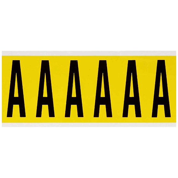 Letter Label, Adhesive Type Removable and Repositionable Adhesive, Application General Identification, Wire and Cable Labeling, APWA Compliant Color No, Background Color Yellow, Character Color Black, Character Color Gradient Solid Color, Character Height 3 in, Character Outline Color Not Applicable, Character Type Letters, Characters Included A, Die Cut Yes, Embossed No, Font Gothic, Includes (6) Labels, Indoor/Outdoor Usage Indoor Only, Letter Casing Uppercase, Material Vinyl