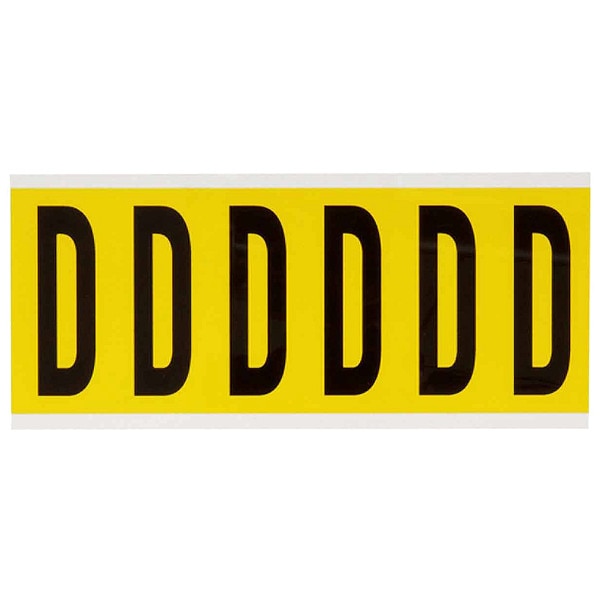 Letter Label, Adhesive Type Removable and Repositionable Adhesive, Application General Identification, Wire and Cable Labeling, APWA Compliant Color No, Background Color Yellow, Character Color Black, Character Color Gradient Solid Color, Character Height 3 in, Character Outline Color Not Applicable, Character Type Letters, Characters Included D, Die Cut Yes, Embossed No, Font Gothic, Includes (6) Labels, Indoor/Outdoor Usage Indoor Only, Letter Casing Uppercase, Material Vinyl