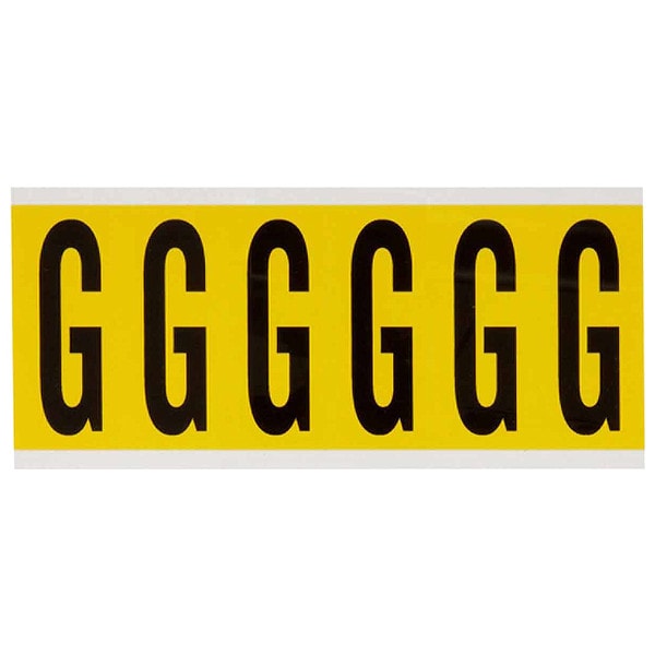 Letter Label, Adhesive Type Removable and Repositionable Adhesive, Application General Identification, Wire and Cable Labeling, APWA Compliant Color No, Background Color Yellow, Character Color Black, Character Color Gradient Solid Color, Character Height 3 in, Character Outline Color Not Applicable, Character Type Letters, Characters Included G, Die Cut Yes, Embossed No, Font Gothic, Includes (6) Labels, Indoor/Outdoor Usage Indoor Only, Letter Casing Uppercase, Material Vinyl