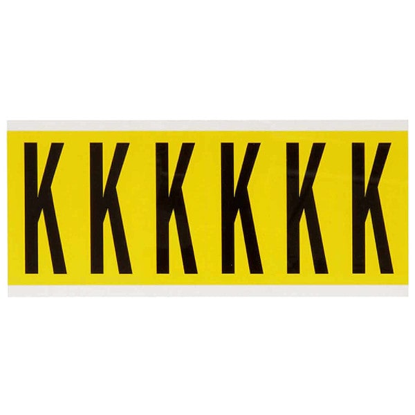 Letter Label, Adhesive Type Removable and Repositionable Adhesive, Application General Identification, Wire and Cable Labeling, APWA Compliant Color No, Background Color Yellow, Character Color Black, Character Color Gradient Solid Color, Character Height 3 in, Character Outline Color Not Applicable, Character Type Letters, Characters Included K, Die Cut Yes, Embossed No, Font Gothic, Includes (6) Labels, Indoor/Outdoor Usage Indoor Only, Letter Casing Uppercase, Material Vinyl