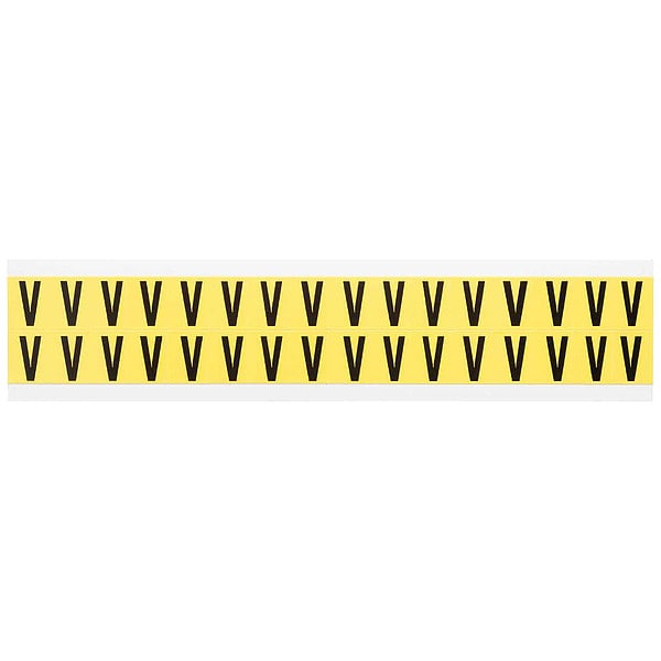 Letter Label, Adhesive Type Removable and Repositionable Adhesive, Application General Identification, Wire and Cable Labeling, APWA Compliant Color No, Background Color Yellow, Character Color Black, Character Color Gradient Solid Color, Character Height 5/8 in, Character Outline Color Not Applicable, Character Type Letters, Characters Included V, Die Cut Yes, Embossed No, Font Gothic, Includes (32) Labels, Indoor/Outdoor Usage Indoor Only, Letter Casing Uppercase, Material Vinyl Cloth