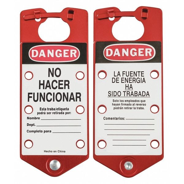 Lockout Hasp, Closed Jaw Hole Size 1 429/1000 in, For Maximum Padlock Shackle Diameter 5/16 in, Hasp Closure Type Snap In, Lockout Material Aluminum, Lockout Material Finish Anodized, Maximum Number of Padlocks 6, Product Type Labeled Hasp, Hasp Style Standard, Header Danger, Includes Write-On Area, Language Spanish, Legend No Hacer Funcionar, Lockout Color Red, Number of Jaws 1, Overall Length 7 64/125 in, Overall Width 3 in, Package Quantity 5