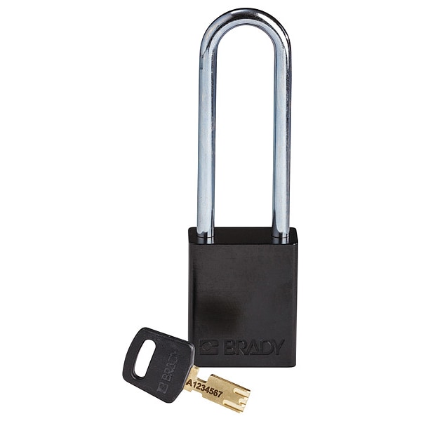Lockout Padlock, Body Color Black, Body Height 1 13/16 in, Body Material Aluminum, Body Thickness 3/4 in, Body Width 1 1/2 in, Header Danger, Horizontal Shackle Clearance 13/16 in, Key Style Linear, Key Type Keyed Different, Non-Removable Key No, Resistance Properties Corrosion Resistant, Shackle Diameter 1/4 in, Shackle Height 3 in, Shackle Material Steel, Shackle Type Open, Vertical Shackle Clearance 3 in, Width Across Shackle 13/16 in, Body Material Coating Anodized, Body Shape Rectangular