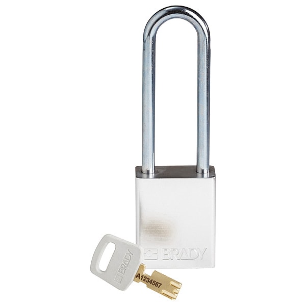Lockout Padlock, Body Color Silver, Body Height 1 13/16 in, Body Material Aluminum, Body Thickness 3/4 in, Body Width 1 1/2 in, Header Danger, Horizontal Shackle Clearance 13/16 in, Key Style Linear, Key Type Keyed Different, Non-Removable Key No, Resistance Properties Corrosion Resistant, Shackle Diameter 1/4 in, Shackle Height 3 in, Shackle Material Steel, Shackle Type Open, Vertical Shackle Clearance 3 in, Width Across Shackle 13/16 in, Body Material Coating Anodized, Body Shape Rectangular