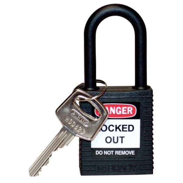 Lockout Padlock, Body Color Black, Body Height 1 3/4 in, Body Material Nylon, Body Thickness 13/16 in, Body Width 1 1/2 in, Header Danger, Horizontal Shackle Clearance 13/16 in, Key Style Standard, Key Type Keyed Different, Non-Removable Key Yes, Resistance Properties Chemical Resistant, Corrosion Resistant, Temperature Resistant, Shackle Diameter 1/4 in, Shackle Height 1 1/2 in, Shackle Material Nylon, Shackle Type Open, Vertical Shackle Clearance 1 1/2 in, Width Across Shackle 3/4 in