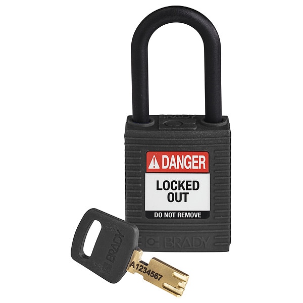 Lockout Padlock, Body Color Black, Body Height 1 13/16 in, Body Material Nylon, Body Thickness 3/4 in, Body Width 1 1/2 in, Header Danger, Horizontal Shackle Clearance 13/16 in, Key Style Linear, Key Type Keyed Different, Non-Removable Key Yes, Resistance Properties Not Applicable, Shackle Diameter 1/4 in, Shackle Height 1 1/2 in, Shackle Material Plastic, Shackle Type Open, Vertical Shackle Clearance 1 1/2 in, Width Across Shackle 13/16 in, Body Material Coating Plastic Encased