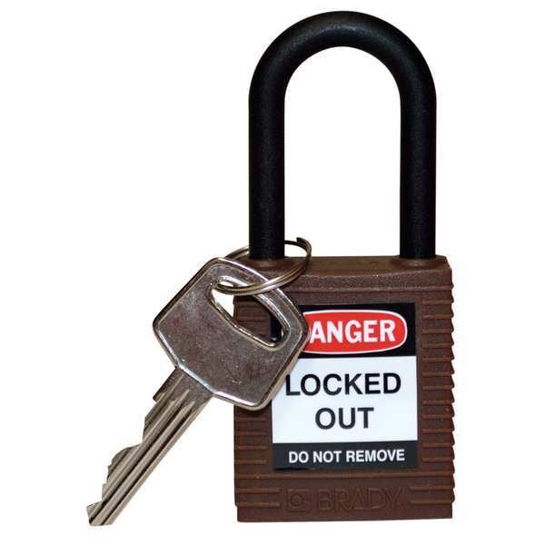 Lockout Padlock, Body Color Brown, Body Height 1 3/4 in, Body Material Nylon, Body Thickness 13/16 in, Body Width 1 1/2 in, Header Danger, Horizontal Shackle Clearance 13/16 in, Key Style Standard, Key Type Keyed Different, Non-Removable Key Yes, Resistance Properties Chemical Resistant, Corrosion Resistant, Temperature Resistant, Shackle Diameter 1/4 in, Shackle Height 1 1/2 in, Shackle Material Nylon, Shackle Type Open, Vertical Shackle Clearance 1 1/2 in, Width Across Shackle 3/4 in
