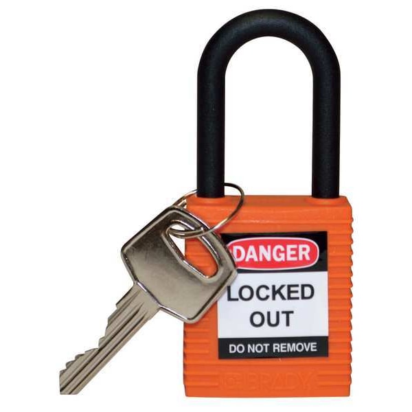 Lockout Padlock, Body Color Orange, Body Height 1 3/4 in, Body Material Nylon, Body Thickness 13/16 in, Body Width 1 1/2 in, Header Danger, Horizontal Shackle Clearance 13/16 in, Key Style Standard, Key Type Keyed Different, Non-Removable Key Yes, Resistance Properties Chemical Resistant, Corrosion Resistant, Temperature Resistant, Shackle Diameter 1/4 in, Shackle Height 1 1/2 in, Shackle Material Nylon, Shackle Type Open, Vertical Shackle Clearance 1 1/2 in, Width Across Shackle 3/4 in