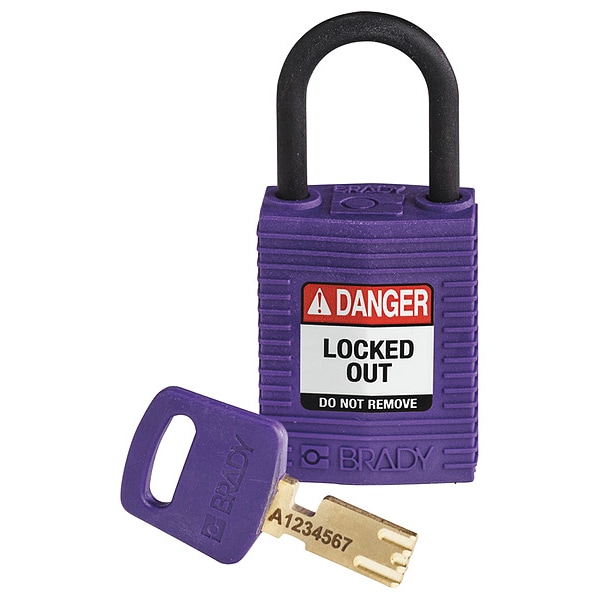 Lockout Padlock, Body Color Purple, Body Height 1 5/8 in, Body Material Nylon, Body Thickness 3/4 in, Body Width 1 1/4 in, Header Danger, Horizontal Shackle Clearance 11/16 in, Key Style Linear, Key Type Keyed Different, Non-Removable Key No, Resistance Properties Not Applicable, Shackle Diameter 3/16 in, Shackle Height 1 in, Shackle Material Plastic, Shackle Type Open, Vertical Shackle Clearance 1 in, Width Across Shackle 3/4 in, Body Material Coating Plastic Encased, Body Shape Rectangular