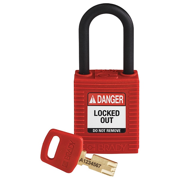 Lockout Padlock, Body Color Red, Body Height 1 13/16 in, Body Material Nylon, Body Thickness 3/4 in, Body Width 1 1/2 in, Header Danger, Horizontal Shackle Clearance 13/16 in, Key Style Linear, Key Type Keyed Different, Non-Removable Key Yes, Resistance Properties Not Applicable, Shackle Diameter 1/4 in, Shackle Height 1 1/2 in, Shackle Material Plastic, Shackle Type Open, Vertical Shackle Clearance 1 1/2 in, Width Across Shackle 13/16 in, Body Material Coating Plastic Encased