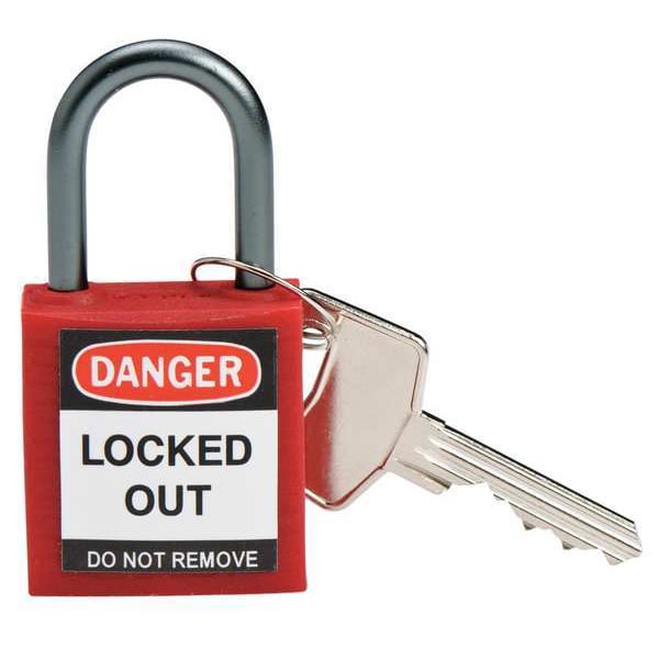 Lockout Padlock, Body Color Red, Body Height 1 3/8 in, Body Material Nylon, Body Thickness 5/8 in, Body Width 1 3/16 in, Header Danger, Key Style Standard, Key Type Keyed Different, Non-Removable Key Yes, Resistance Properties Chemical Resistant, Corrosion Resistant, Temperature Resistant, Shackle Diameter 3/16 in, Shackle Height 1 in, Shackle Material Aluminum, Shackle Type Open, Vertical Shackle Clearance 1 in, Width Across Shackle 3/4 in, Body Shape Rectangular