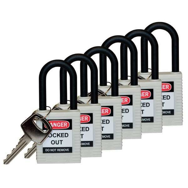 Lockout Padlock, Keyed Different, Nylon, White, 1 1/2 in Shackle Height, 1 1/2 in Body Width, 6 PK