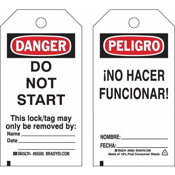 Lockout Tag, Front Side Legend Do Not Remove Tag, Header Danger; Peligro, Language English, Spanish, Legend Type Text, Mount Type Nylon Ties, Number of Printed Sides 2, Overall Height 5 3/4 in, Overall Width 3 in, Reverse Side Legend No Hacer Funcionar! Nombre Fecha, Sign Background Color White, Sign Material Polyester, Sign Out Sections Date, Fecha, Name, Nombre, Signage Type Tag, Write-On Surface Yes, For Location Outdoor, For Use With Tagout Device, Grommet Material Brass