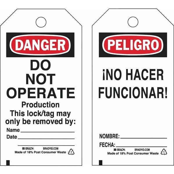Lockout Tag, Front Side Legend Danger Do Not Operate, Header Danger; Peligro, Language English, Spanish, Legend Type Text, Mount Type Nylon Ties, Number of Printed Sides 2, Overall Height 5 3/4 in, Overall Width 3 in, Reverse Side Legend No Hacer Funcionar! Nombre Fecha, Sign Background Color White, Sign Material Heavy Duty Polyester, Sign Out Sections Date, Fecha, Name, Nombre, Signage Type Tag, Write-On Surface Yes, For Location Indoor, Outdoor, For Use With Lockout Tagout