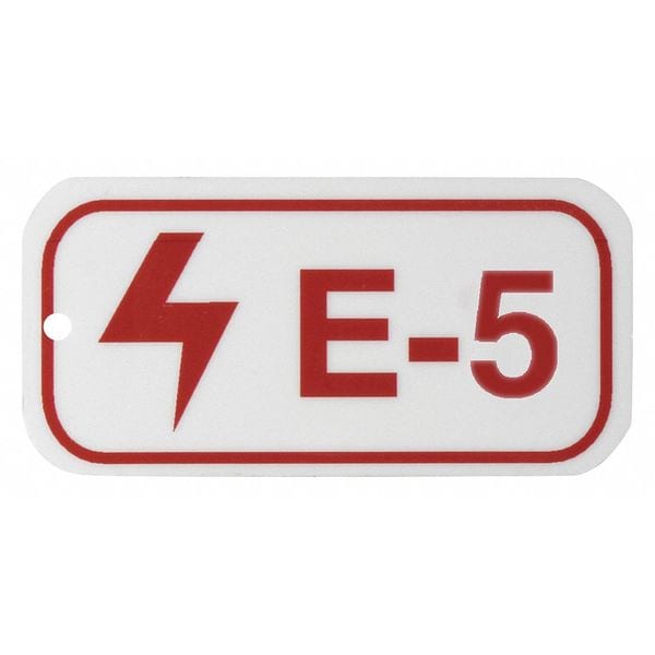 Lockout Tag, Front Side Legend E-5, Header None/ No Header, Language English, Legend Type Text, Mount Type Adhesive Backing, Number of Printed Sides 1, Overall Height 1 1/2 in, Overall Width 3 in, Reverse Side Legend Not Applicable, Sign Background Color White, Sign Material Polystyrene, Sign Out Sections Not Applicable, Signage Type Tag, Write-On Surface No, For Location Indoor, Outdoor, Grommet Material No Grommet, Hole Diameter 1/4 in, Includes (25) Tags, Includes Ties Yes, Legend Color Red
