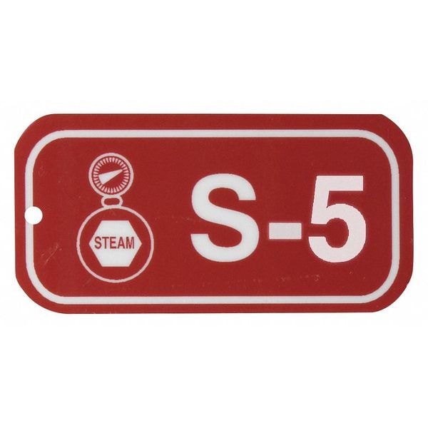 Lockout Tag, Front Side Legend S-5, Header None/ No Header, Language English, Legend Type Text, Mount Type Holes, Number of Printed Sides 1, Overall Height 1 1/2 in, Overall Width 3 in, Reverse Side Legend Not Applicable, Sign Background Color Red, Sign Material Polystyrene, Sign Out Sections Not Applicable, Signage Type Tag, Write-On Surface No, For Location Indoor, Outdoor, Grommet Material No Grommet, Hole Diameter 1/4 in, Includes (25) Tags, Includes Ties Yes, Legend Color White