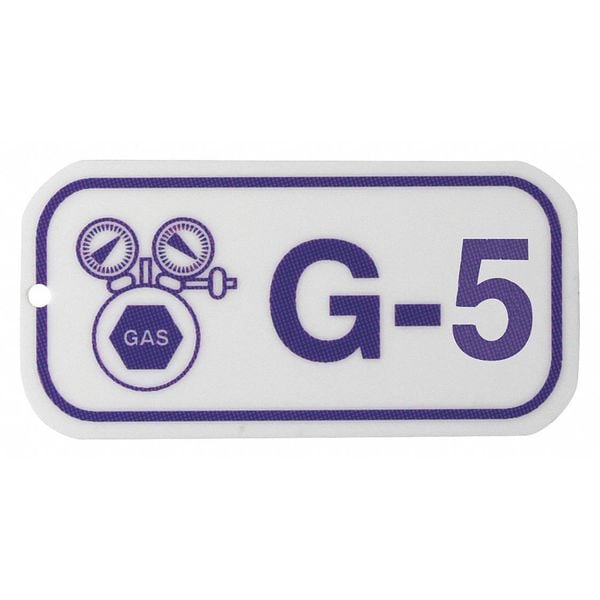 Lockout Tag, Front Side Legend G-5, Header None/ No Header, Language English, Legend Type Text, Mount Type Holes, Number of Printed Sides 1, Overall Height 1 1/2 in, Overall Width 3 in, Reverse Side Legend Not Applicable, Sign Background Color White, Sign Material Polystyrene, Sign Out Sections Not Applicable, Signage Type Tag, Write-On Surface No, For Location Indoor, Outdoor, Grommet Material No Grommet, Hole Diameter 1/4 in, Includes (25) Tags, Includes Ties Yes, Legend Color Purple