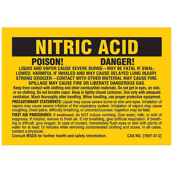 NFPA Label, Adhesive Adhesive, Adhesive Material Acrylic, Adhesive Properties Permanent Adhesive, Background Color Yellow, Hazard Communication Standard NFPA, Height 2 in, Kit Contents Not Applicable, Lamination Type Laminated, Language English, Material Polyester, Material Properties Not Applicable, Maximum Service Temperature 230 Degrees F, Minimum Service Temperature -40 Degrees F, Mounting Type Adhesive, Preprinted Images No Image, Preprinted Text Nitric Acid, Product Type NFPA Label