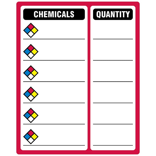 Sign, Chemicals: Quantity:, Vinyl, Height 15 in, Width 12 in, Header No Header, Legend Style Symbol and Text, Language English, Mounting Style Magnetic, Thickness 0.025 in, Sign Shape Rectangle, Operating Temp. Range 0 Degrees to 158 Degrees F, Retroreflective Grade Not Retroreflective