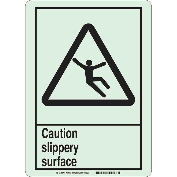 Safety Sign, Sign Subject Matter Accident Prevention, Height 14 In., Width 10 In., Sign Material Polyester, Sign Mounting Style Adhesive Surface, Header No Header, Legend Caution Slippery Surface, Printed Language English, Sign Shape Rectangle