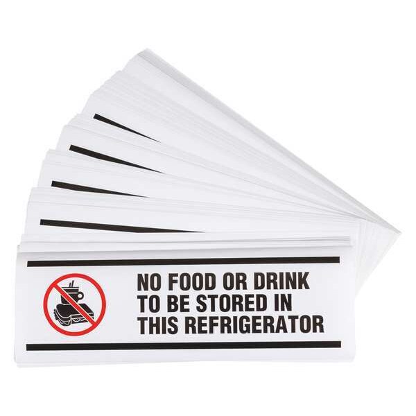 Hazardous Warning Label, Vertical Rectangle, Number of Printed Sides 1, English, Sign Format Other Format, Sign Legend NO FOOD OR DRINK TO BE STORED IN THIS REFRIGERATOR, Sign Legend Style Symbol and Text, Package Quantity 100