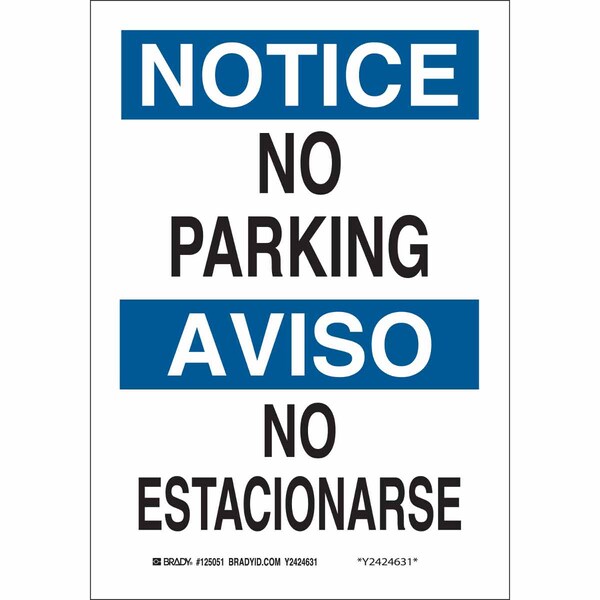 No Parking Sign, 7" W, 10" H, English, Spanish, Aluminum, White