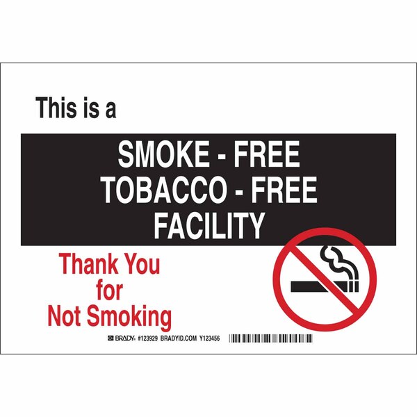 No Smoking Sign, Sign Subject Matter No Smoking, Height 10 in, Width 14 in, Sign Material Polyester, Sign Mounting Style Adhesive Surface, Header No Header, Legend This Is A Smoke-Free Tobacco-Free Facility Thank You For Not Smoking, Printed Language English, Sign Shape Rectangle