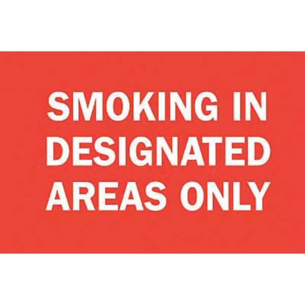 No Smoking Sign, Sign Subject Matter No Smoking, Height 10 in, Width 14 in, Sign Material Aluminum, Sign Mounting Style With Mounting Holes, Header No Header, Legend Smoking In Designated Areas Only, Printed Language English, Sign Shape Rectangle