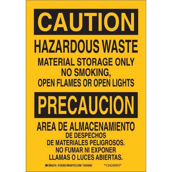 No Smoking Sign, Sign Subject Matter Chemical, Gas or Hazardous Materials, Height 10 in, Width 7 in, Sign Material Polyester, Header Caution/Precaucion, Legend Hazardous Waste Material Storage Only No Smoking, Open Flames Or Open Lights/Area De Almacenamiento De Desechos De Materiales Peligrosos. No Fumar Ni Exponer Llamas O Luces Abiertas., Printed Language English, Spanish, Sign Shape Rectangle