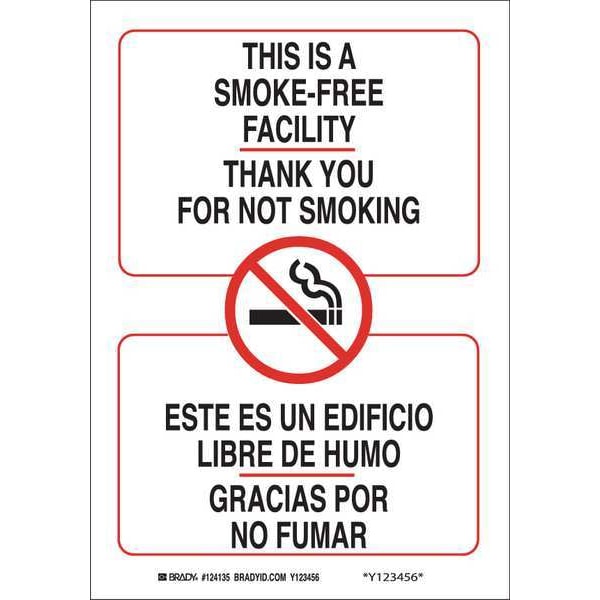 No Smoking Sign, Sign Subject Matter No Smoking, Height 14 in, Width 10 in, Sign Material Polyester, Sign Mounting Style Adhesive Surface, Header No Header, Legend This Is A Smoke- Free Facility Thank You For Not Smoking/Este Es Un Edificio Libre De Humo Gracias Por No Fumar, Printed Language English, Spanish, Sign Shape Rectangle