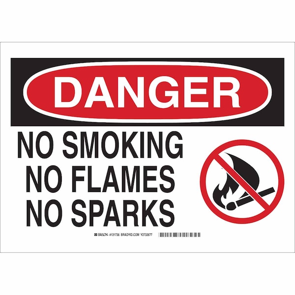 No Smoking Sign, Sign Subject Matter No Smoking, Height 7 in, Width 10 in, Sign Material Polyester, Sign Mounting Style Adhesive Surface, Header Danger, Legend No Smoking No Flames No Sparks, Printed Language English, Sign Shape Rectangle