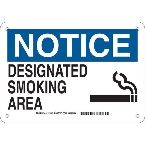 Smoking Sign, Sign Subject Matter No Smoking, Height 7 in, Width 10 in, Sign Material Plastic, Sign Mounting Style With Mounting Holes, Header Notice, Legend Designated Smoking Area, Printed Language English, Sign Shape Rectangle