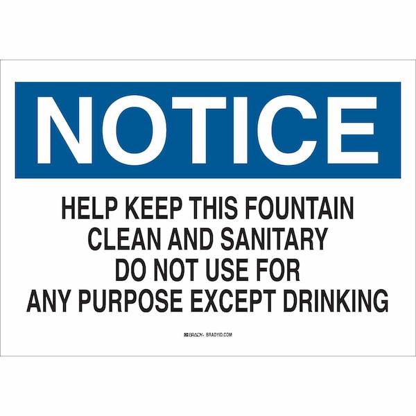 Notice Sign, Sign Subject Matter Cleaning and Maintenance, Height 10 In., Width 14 In., Sign Material Fiberglass, Sign Mounting Style With Mounting Holes, Header Notice, Legend Help Keep This Fountain Clean And Sanitary Do Not Use For Any Purpose Except Drinking, Printed Language English, Sign Shape Rectangle