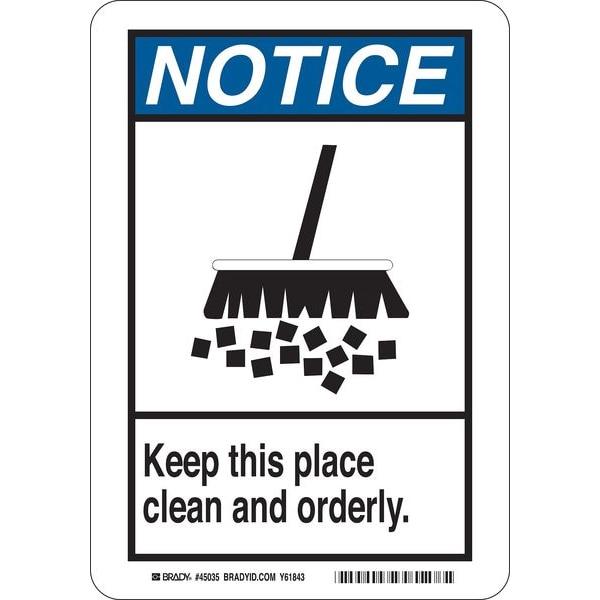 Notice Sign, Sign Subject Matter Cleaning and Maintenance, Height 14 In., Width 10 In., Sign Material Polyester, Sign Mounting Style Adhesive Surface, Header Notice, Legend Keep This Place Clean And Orderly., Printed Language English, Sign Shape Rectangle