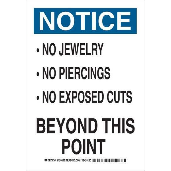 Notice Sign, Sign Subject Matter Facility, Height 10 In., Width 7 In., Sign Material Polyester, Sign Mounting Style Adhesive Surface, Header Notice, Legend No Jewelry No Piercings No Exposed Cuts Beyond This Point, Printed Language English, Sign Shape Rectangle
