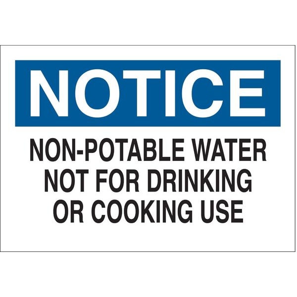 Notice Sign, Sign Subject Matter Potable Water, Height 7 In., Width 10 In., Sign Material Plastic, Sign Mounting Style With Mounting Holes, Header Notice, Legend Non-Potable Water Not For Drinking Or Cooking Use, Printed Language English, Sign Shape Rectangle