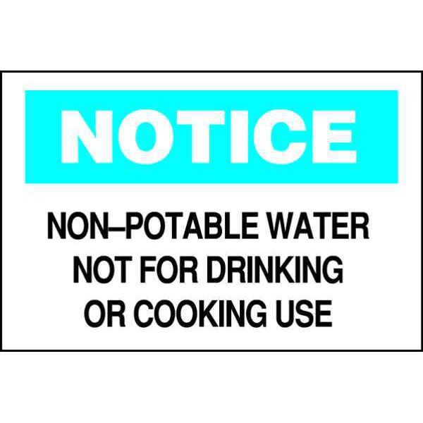 Safety Sign, Sign Subject Matter Potable Water, Height 7 In., Width 10 In., Sign Material Polyester, Sign Mounting Style Adhesive Surface, Header Notice, Legend Non-Potable Water Not For Drinking Or Cooking Use, Printed Language English, Sign Shape Rectangle