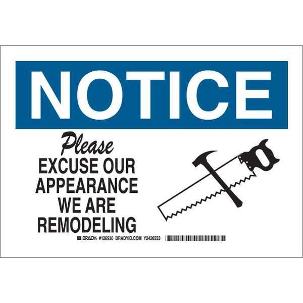 Notice Sign, Sign Subject Matter Humor, Height 7 In., Width 10 In., Sign Material Polyester, Sign Mounting Style Adhesive Surface, Header Notice, Legend Please Excuse Our Appearance We Are Remodeling, Printed Language English, Sign Shape Rectangle