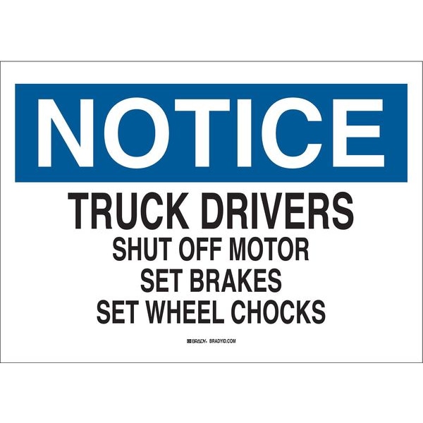 Notice Sign, Sign Subject Matter Chock Wheels, Height 10 In., Width 14 In., Sign Material Plastic, Sign Mounting Style With Mounting Holes, Header Notice, Legend Truck Drivers Shut Off Motor Set Brakes Set Wheel Chocks, Printed Language English, Sign Shape Rectangle