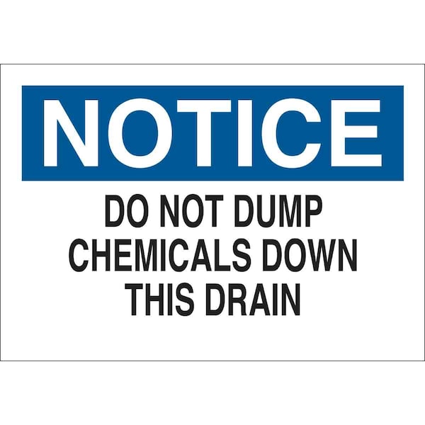Notice Sign, Sign Subject Matter Chemical, Gas or Hazardous Materials, Height 10 in, Width 14 in, Sign Material Plastic, Sign Mounting Style With Mounting Holes, Header Notice, Legend Do Not Dump Chemicals Down This Drain, Printed Language English, Sign Shape Rectangle