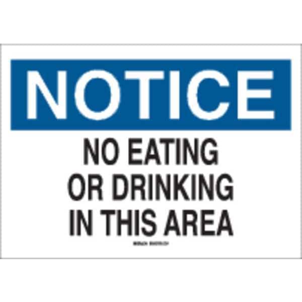 Notice Sign, Sign Subject Matter Eating and Drinking Restriction, Height 10 in, Width 14 in, Sign Material Plastic, Sign Mounting Style With Mounting Holes, Header Notice, Legend No Eating Or Drinking In This Area, Printed Language English, Sign Shape Rectangle