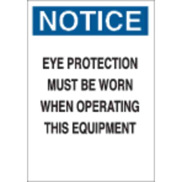 Notice Sign, Sign Subject Matter Personal Protection, Height 10 in, Width 7 in, Sign Material Polyester, Sign Mounting Style Adhesive Surface, Header Notice, Legend Eye Protection Must Be Worn When Operating This Equipment, Printed Language English, Sign Shape Rectangle