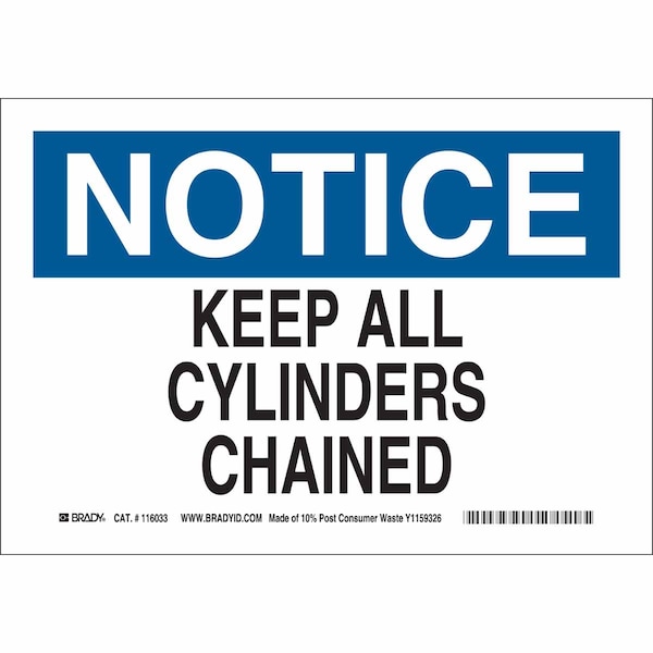 Notice Sign, Sign Subject Matter Chemical, Gas or Hazardous Materials, Height 7 in, Width 10 in, Sign Material Plastic, Sign Mounting Style With Mounting Holes, Header Notice, Legend Keep All Cylinders Chained, Printed Language English, Sign Shape Rectangle